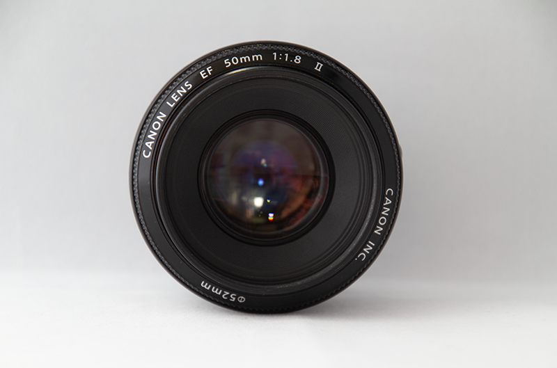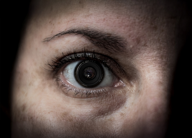 I photographed a closeup image of my own eye, and flipped it to a mirrored image in Photoshop. I did not worry about white balance because I knew I was going to alter the color and tone to make it "moody" looking. I also photographed my Canon EF 50mm lens inside a studio lightbox. In Photoshop, I edited and combined the images into a single composite image, then tweaked colors and added a vignette to achieve the desired look.