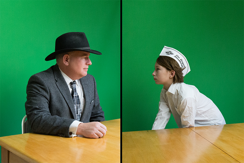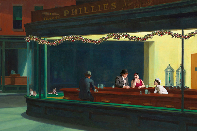 I photographed myself and members of my family against a green screen, being mindful of the light direction from the original representation of the painting. I first imported the portraits into Lightroom for initial corrections. Then, I exported each portrait as a layer in Photoshop, on top of a layer containing the Hopper painting. I added additional layers of our cats from previous photos, plus the garland and menorah from royalty-free clipart. I employed a combination of filters and textures to match the look of the original painting.